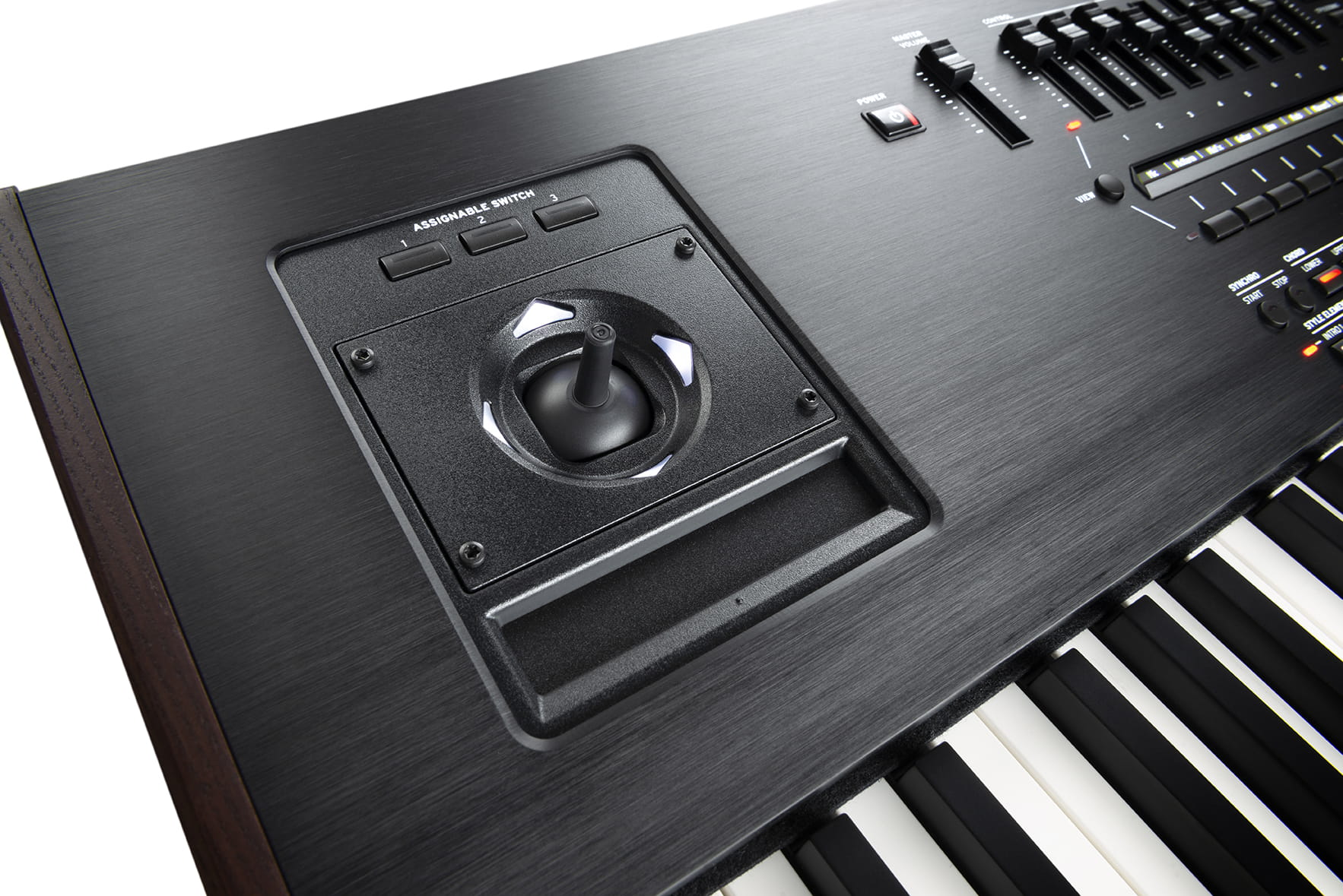 - Główne kontrolery: Master Volume, Octave Transpose, Master Transpose, Dial, Up/+, Down/-, Joystick (Pitch + Modulation), Ribbon, 3 Assignable Switches, Search, Shift, Keyboard Sounds On/Off, Split, Ensemble, Rec/Edit, Menu, Exit