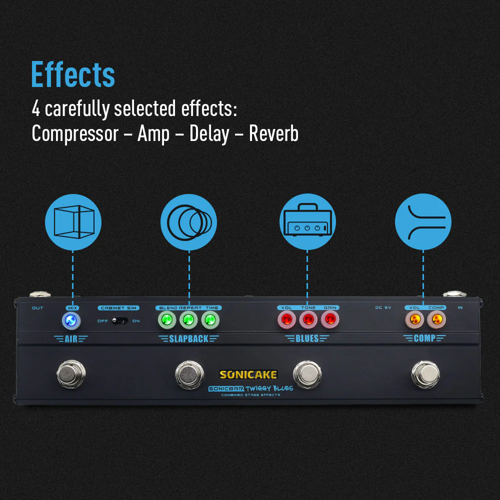 Szukasz klasycznego, ciepłego brzmienia bluesowego w kompaktowej formie? SONICAKE QCE-20 Twiggy Blues to multiefekt gitarowy typu „all-in-one”, który oferuje wszystko, czego potrzebujesz do uzyskania vintage’owego soundu – zarówno na scenie, jak i w domu.